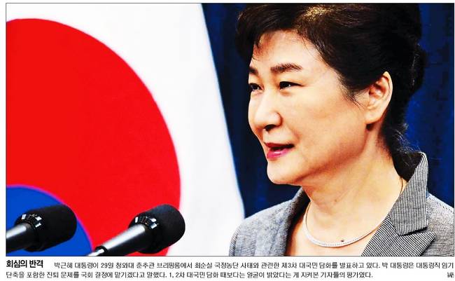 한겨레는 “자신의 거취에 대한 결정을 국회로 떠넘겼다. 정치권과 시민사회의 즉각적인 퇴진 요구를 사실상 거부한 것으로, 국회 위임 형식을 통해 시간 끌기에 나선 것으로 보인다. 박 대통령은 박근혜 최순실 게이트에 대해서도 또다시 결백을 주장했다”고 했다.