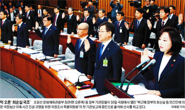 최순실 국정조사도 막이 올랐다. 세계일보는 조윤선 문화체육관광부 장관 등 정부 기관장들이 30일 국회에서 열린 ‘박근혜 정부의 최순실 등 민간인에 의한 국정농단 의혹 사건 진상 규명을 위한 국정조사 특별위원회’의 첫 기관보고에 증인으로 출석해 선서를 하고 있는 모습을 1면 사진으로 전했다. 세계일보는 “국정조사는 이날 대검찰청, 국민연금공단, 문체부, 법무부, 보건복지부 등에 대한 기관보고를 진행했다”면서 “주요 기관장이 공석이거나 출석을 거부해 첫걸음부터 삐걱거렸지만 K스포츠재단 자금의 사적 이용, 청와대의 마약류 의약품 830여정 사용 등이 새로운 사실로 확인됐다”고 보도했다.