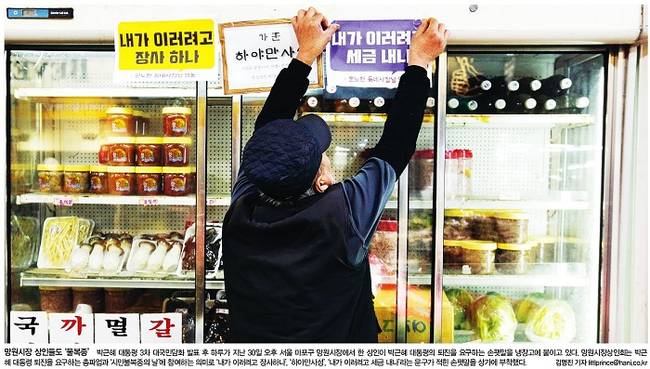 시민들의 불복종 선언에 주목한 신문도 있었다. 한겨레는 30일 오후 서울 마포구 망원시장에서 한 상인이 박 대통령의 퇴진을 요구하는 손팻말을 냉장고에 붙이고 있는 모습을 1면 사진으로 전했다. 한겨레는 “망원시장상인회는 박 대통령 퇴진을 요구하는 총파업과 ‘시민불복종의 날’에 참여하는 의미로 ‘내가 이러려고 장사하나’ ‘하야만사성’ ‘내가 이러려고 세금 내나’라는 문구가 적힌 손팻말을 상가에 부착했다”고 보도했다.