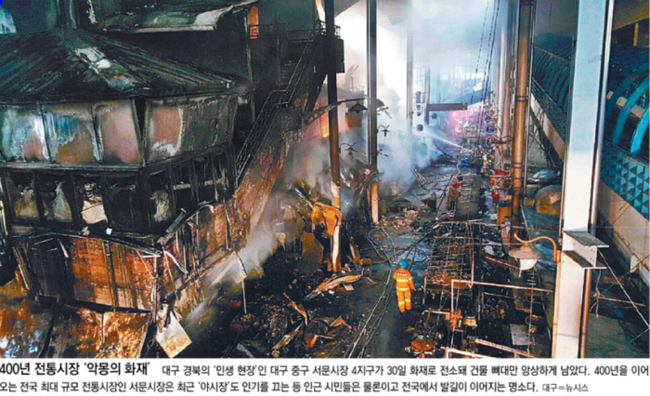 동아일보는 서문시장 화재에 주목했다. 동아일보는 대구 경북의 ‘민생 현장’인 대구 중구 서문시장 4지구가 30일 화재로 전소돼 건물 뼈대만 앙상하게 남은 모습을 1면 사진으로 전했다. 동아일보는 “400년 역사의 서문시장은 전국 최대 규모의 전통시장으로 점포가 4600여 개에 이르고 상인은 2만 명이 넘는다”면서 “매일 수십만 명의 손님이 찾고 올 6월 야시장 개설을 계기로 활기가 더해지던 차에 대형 악재를 만났다”고 보도했다.