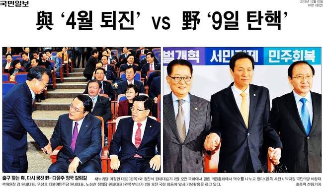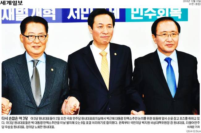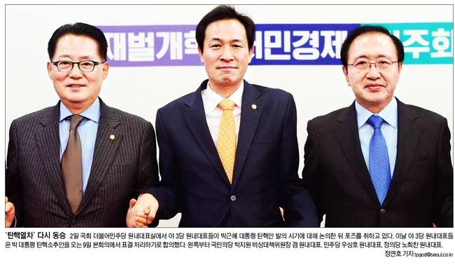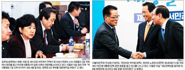 서울신문은 탄핵 절차 기차에 다시 한마음으로 동승한 야3당에 주목했다. 서울은 “더불어민주당과 국민의당, 정의당은 3일 새벽 박근혜 대통령에 대한 탄핵소추안을 발의했다. 세 명의 원내대표는 8일 본회의 보고->9일 탄핵안 표결에 합의했다. 우여곡절 끝에 탄핵안이 첫 단추를 꿰면서 앞으로 일주일이 정국의 운명을 가를 전망”이라고 했다.