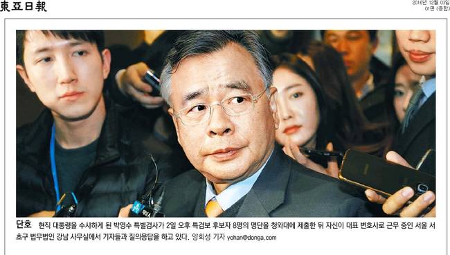 동아일보는 현직 대통령을 수사하게 된 박영수 특별 검사의 모습을 1면에 담았다. 동아는 “박 특검호는 비극이라는 항구에서 출발했다. 높은 파도와 거센 바람을 헤쳐 나가야 하는 어려운 항해겠지만 끝내는 새 희망이라는 항구에 닿을 것이란 국민의 기대를 한 몸에 받고 있다”고 전했다. 동아에 따르면 박 특검은 미르와 K스포츠재단 대기업 출연금의 뇌물죄 적용 여부를 비롯해 박 대통령의 세월호 7시간 부재, 청와대 약물 반입, 고 최태민씨 의혹 등 국민이 의문을 갖는 모든 사안을 철저하게 수사하겠다는 의지를 밝혔다.