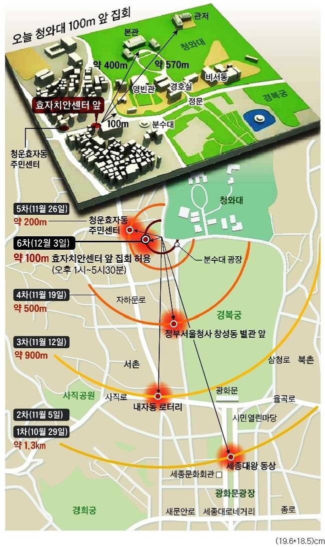 중앙일보는 “퇴진행동이 청와대 근접 거리까지 행진 신고를 하면 경찰이 이를 금지했고, 법원은 늘 집회 주최 측의 우군 역할을 했다. 촛불을 든 시민들은 매주 청와대 앞으로 성큼 다가서고 있다. 청와대가 가까워질수록 구호는 더욱 커졌다”고 밝혔다.