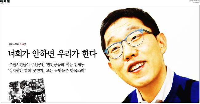 한겨레는 촛불시민들이 주인공인 ‘만민공동회’를 여는 김제동의 모습을 1면으로 보도했다. 한겨레는 “김제동이 작정하고 할 말을 쏟아냈다. 다시는 국민의 주권을 정치엘리트나 소수 기득권층에게 위임할 수 없으며 ‘반시민행위특별처벌위원회’라도 만들어서 특권남용과 부정부패에 대한 발본색원에 나서야 한다고 주장했다”고 했다.