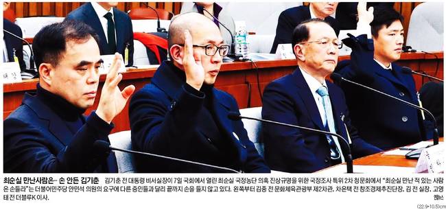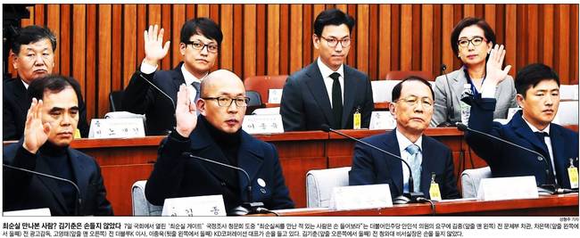 조선일보는 제2차 청문회에서 ‘최순실씨를 만나본 적이 있느냐’는 질문에 손을 든 증인들의 모습을 1면에 담았다. 조선은 관련기사에서 “2차 청문회에 출석한 증인들은 7일 핵심 쟁점 의혹에 대해 박근혜 대통령 또는 최순실씨 지시에 따랐던 것이라고 했다”면서 “그러나 의혹의 중심에 있는 최씨가 이날 청문회 출석을 거부하면서 의혹과 논란만 계속됐다”고 전했다. 조선은 “광고감독 출신 차은택씨는 이날 ‘최씨가 배후에서 대통령을 조종했다고 생각하느냐’는 질문에 ‘조종까지는 모르겠다. 하지만 대통령에게 이럴 수 있는 사람이 과연 있을까 하는 생각을 했다’고 말했다. 차씨는 ‘최씨 요청으로 문화창조와 관련한 글을 써줬는데, 얼마 후 대통령 연설에 언급됐다’고도 했다”고 게재했다. 그러면서 “차씨는 ‘최순실씨와 대통령이 거의 같은 급에 있는 게 아닌가라고 생각했다’고 했다”고 보도했다.