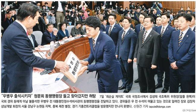 동아일보는 김성태 국조특위 위원장이 2차 청문회에 불출석한 우병우 전 대통령 민정수석비서관의 동행명령장을 전달하는 모습을 1면에 걸었다. 동아는 사진설명에서 “경위들은 우 전 수석이 머물고 있는 것으로 알려진 장모 김장자 삼남개발 회장의 서울 강남구 논현동 자택, 충북 제천 별장, 경기 기흥컨트리클럽을 방문했지만 만나지 못했다”고 보도했다. 동아는 또 다른 관련기사에서 “국회의 박근혜 대통령 탄핵소추안 처리(9일) 이후가 더 막막하다는 우려의 목소리가 높다”면서 “정치권은 탄핵안이 가결되느냐 부결되느냐의 머릿수 싸움에만 몰두했을 뿐 ‘탄핵 그 후’ 정국수습 방안에 대해선 침묵했다”고 전했다.