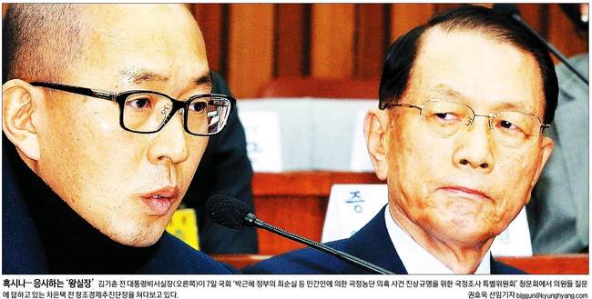 한겨레신문은 김 전 실장이 2차 청문회에서 김종 전 문화체육관광부 제2차관이 의원들의 질의에 답하는 모습을 바라보는 순간을 신문 1면에 내걸었다. 한겨레는 관련기사에서 “그는 ‘대통령을 제대로 보필 못해서 이런 사태가 벌어졌다. 국민들게 부끄럽고 죄송하다’면서도 최씨의 국정농단 방조·묵인, 자신의 직권남용 등 쏟아지는 의혹에는 모르쇠로 일관했다”고 전했다. 한겨레는 김 전 실장이 “박근혜 대통령이 집무시간에 머리 손질을 하느라 시간을 낭비한 사실을 ‘전혀 알지 못했다’고 주장했다. 비선 실세인 최순실(구속기수)씨의 국정농단에 대해서도 ‘전혀 몰랐다. 검찰에서 조사해보라’며 최씨의 존재 자체를 몰랐다고 거듭 주장했다”고 보도했다.