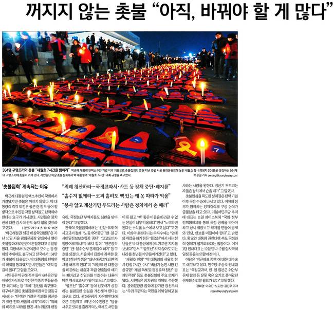 경향신문은 이날 1면 사진기사에서 박근혜 대통령 탄핵소추안 가결 이후 처음으로 촛불집회가 열린 지난 10일 서울 광화문광장에 놓인 세월호 참사 희생자 304명을 상징하는 304개의 구명조끼에 촛불이 켜져 있는 모습을 담았다.