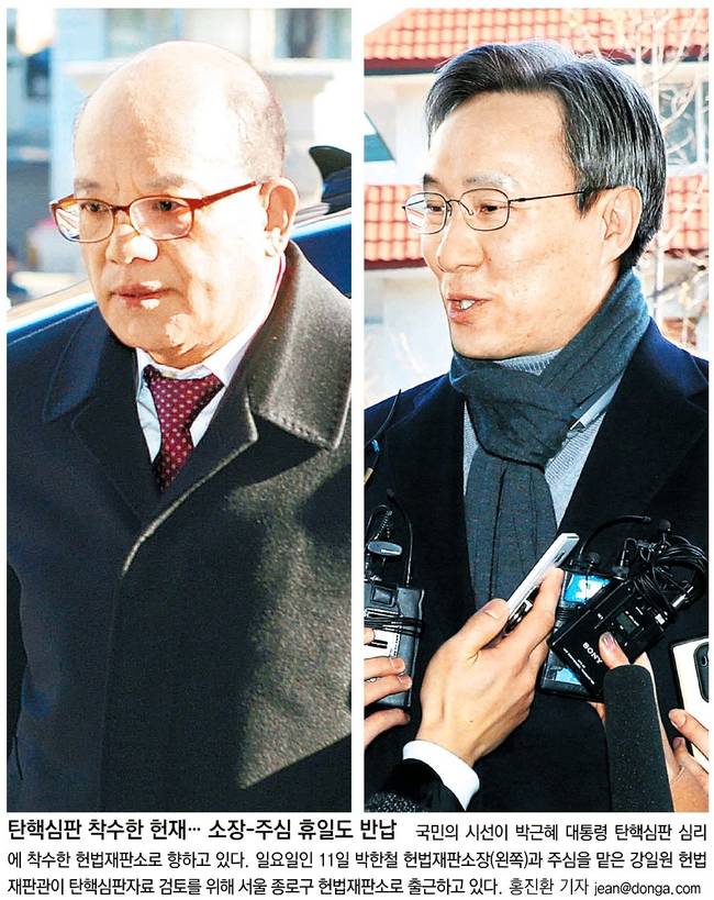 동아일보도 박한철 소장과 강일원 헌법재판관이 헌법재판소로 출근하는 모습을 전하며 "12일 첫 평의에서는 박 대통령 탄핵심판 진행절차, 박 대통령 소환 문제, 집중 심리 여부 등이 논의될 것으로 전망된다"며 "2004년 노무현 전 대통령의 탄핵심판 사건에서 심판 청구 6일 만에 열린 첫 평의에서도 재판관들은 본안사건 심리보다 변론 기일이나 소환 문제 등 절차적인 부분에 대한 논의를 주로 했다"고 전했다.