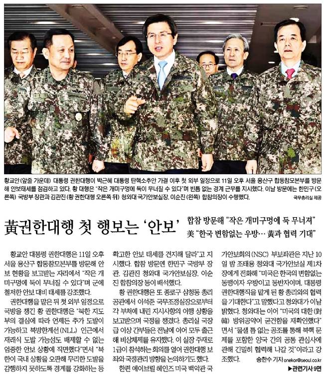서울신문, 세계일보, 중앙일보는 황교안 대통령 권한대행이 박근혜 대통령 탄핵소추안 가결 이후 첫 외부 일정으로 11일 오후 서울 용산구 합동참모본부를 방문해 안보태세를 점검하고 장면을 담았다. 황 대행은 이 자리에서 "작은 개미구멍에 둑이 무너질 수 있다"며 빈틈 없는 경계 근무를 지시했다"고 서울신문은 보도했다.