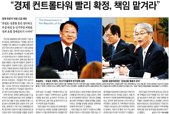 조선일보는 국회의 박근혜 대통령 탄핵 가결이 경제에 미칠 악영향을 차단하기 위해 경제‧금융 수장들은 주말에도 급하게 움직였다며 유일호(왼쪽 사진) 경제부총리가 지난 11일 서울 중구 프레스센터에서 외신기자 간담회를 연 장면과 임종룡(맨 오른쪽) 금융위원장이 정부 서울청사에서 은행장 등 금융계 인사들을 만난 장면을 실었다.