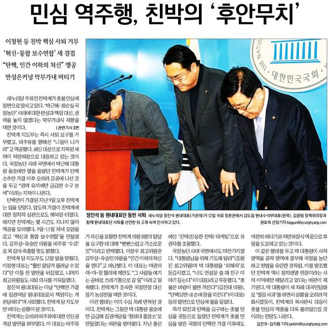반면 새누리당 주류인 친박계가 촛불민심에 정면으로 맞서고 있다고 경향신문은 분석했다.