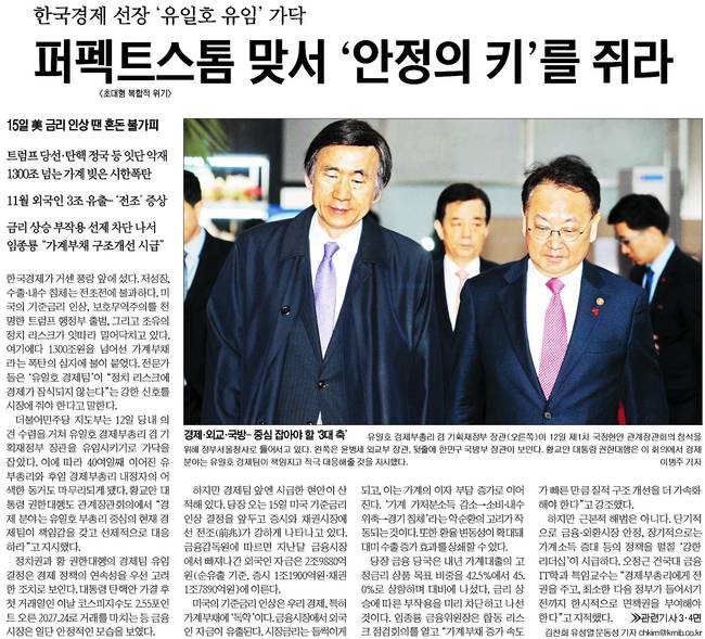 이어 국민일보는 "더불어민주당 지도부는 12일 당내 의견 수렴을 거쳐 유일호 경제부총리 겸 기획재정부 장관을 유임시키기로 가닥을 잡았다"며 "이에 따라 40여일째 이어진 유 부총리와 후임 경제부총리 내정자의 어색한 동거도 마무리되게 됐다"고 보도했다.