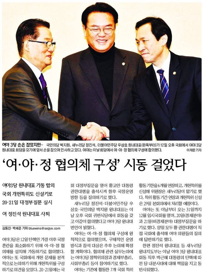 동아일보, 서울신문, 세계일보는 새누리당 정진석(가운데), 더불어민주당 우상호(오른쪽), 국민의당 박지원 원내대표가 12일 국회 회동에 앞서 악수하고 있는 모습을 담았다.