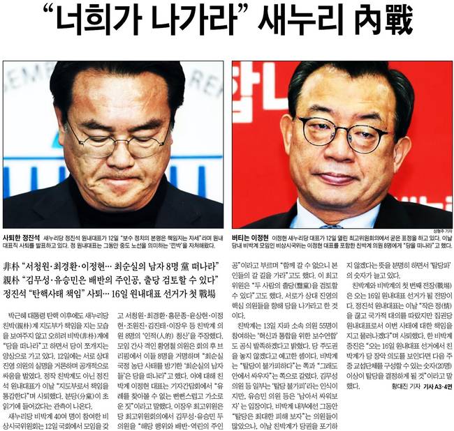 조선일보는 "박근혜 대통령 탄핵 이후에도 새누리당 친박계 지도부가 책임을 지는 모습을 보여주지 않고 오히려 비박계에 "당을 떠나라"고 하면서 당이 쪼개지는 양상으로 가고 있다"고 전했다.