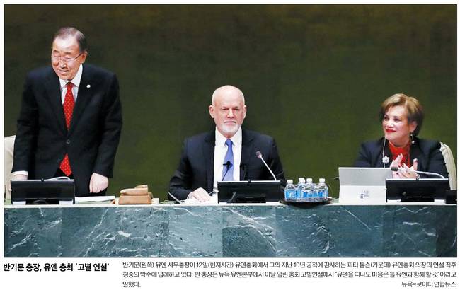 한국일보는 반기문(왼쪽) 유엔 사무총장이 12일(현지시간) 유엔총회에서 그의 지난 10년 공적에 감사하는 피터 톰슨(가운데) 유엔총회 의장의 연설 직후 청중의 박수에 답례하고 있는 모습을 전했다.