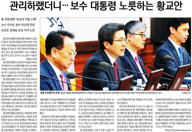 경향신문은 "황교안 대통령 권한 대행의 행보가 심상치 않다. 박근혜 대통령 탄핵소추안 가결 이후 국정공백을 최소화하며 상황관리에 중점을 두기보다 국정 장악력 확대를 꾀하고 있다"며 "황 권한대행이 '보수 대통령'을 꿈꾸고 있는 것 아니냐는 말이 나올 정도"라고 꼬집었다.