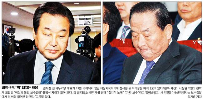 세계일보도 새누리당 김무성 전 대표(오른쪽)가 13일 오전 국회 의원회관에서 비박계가 주축인 비상시국위원회의 긴급회의를 마친 뒤 기자간담회를 개최한 모습과 새누리당 친박계 서청원 의원(오른쪽)이 13일 오후 국회 의원회관에서 열린 '혁신과 통합 보수연합' 출범식에서 눈을 감은 채 생각에 잠겨있는 모습을 함께 담았다.