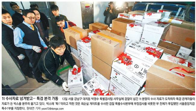 박스에 '특1'이라고 적힌 것은 최순실 게이트를 수사한 검찰 특별수사본부에 부장검사를 비롯한 부 전체가 투입됐던 서울중앙지검 특수 1부를 지칭한다.