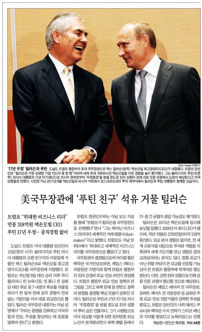 조선일보, 중앙일보는 도널드 트럼프 행정부의 초대 국무장관으로 렉스 틸러슨(왼쪽) 엑손모빌 최고경영자가 내정됐다는 소식과 함께 지난 2011년 8월 엑손모빌과 러시아 석유회사 로스네프트와의 투자 계약식에서 틸러슨이 푸틴 대통령과 함께 한 모습을 전했다.