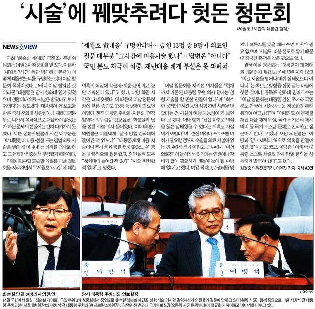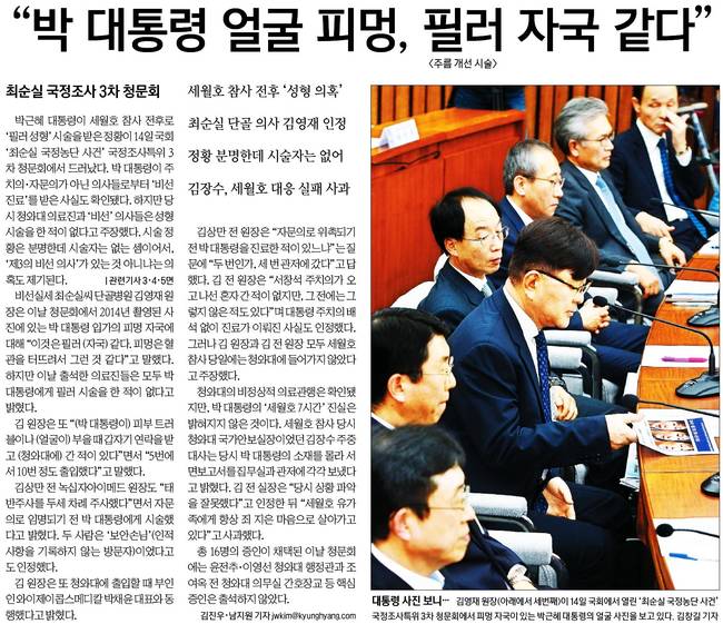 경향은 "박근혜 대통령이 세월호 참사 전후로 '필러 성형'시술을 받은 정황이 14일 국회 '최순실 국정농단 사건' 국정조사특위 3차 청문회에서 드러났다"며 "박 대통령이 주치의‧자문의가 아닌 의사들로부터 '비선진료'를 받은 사실도 확인됐다"고 전했다.