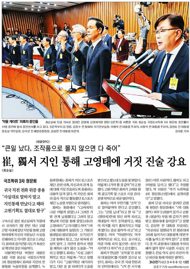 주요 종합일간지들은 15일자 1면 사진으로 전날 14일 국회에서 열린 '최순실 국정농단 사건' 국정조사특위 3차 청문회에서 제기된 의혹들을 집중적으로 다뤘다.