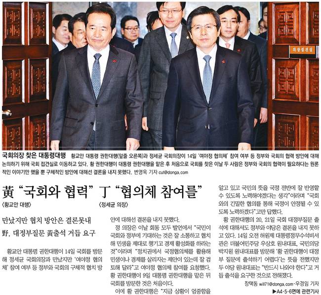 황 권한대행이 대통령 권한대행을 맡은 후 처음으로 국회를 찾은 이날 두 사람은 정부와 국회의 협력이 필요하다는 원론적인 이야기만 했을 뿐 구체적인 방안에 대해선 결론을 내지 못했다.