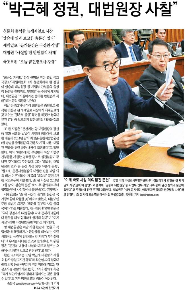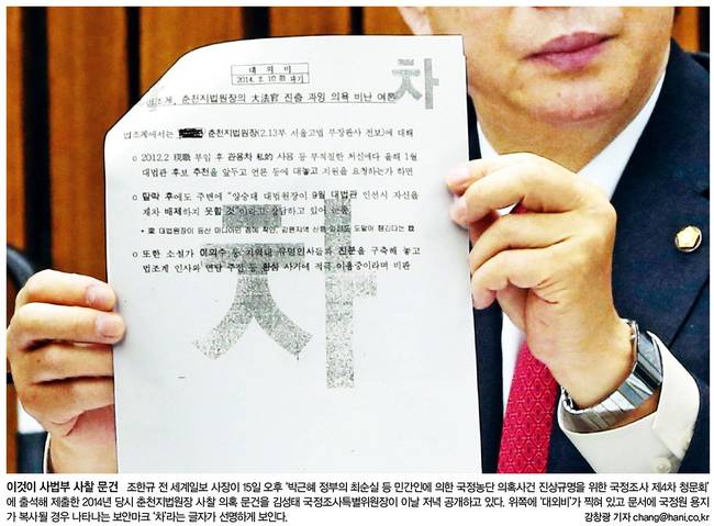 한겨레도 조한규 전 세계일보 사장이 15일 오후 '박근혜 정부의 최순실 등 민간인에 의한 국정농단 의혹사건 진상규명을 위한 국정조사 제4차 청문회'에 출석해 제출한 2014년 당시 춘천지법원장 사찰 의혹 문건을 김성태 국정조사특별위원장이 이날 공개하는 모습을 전했다.