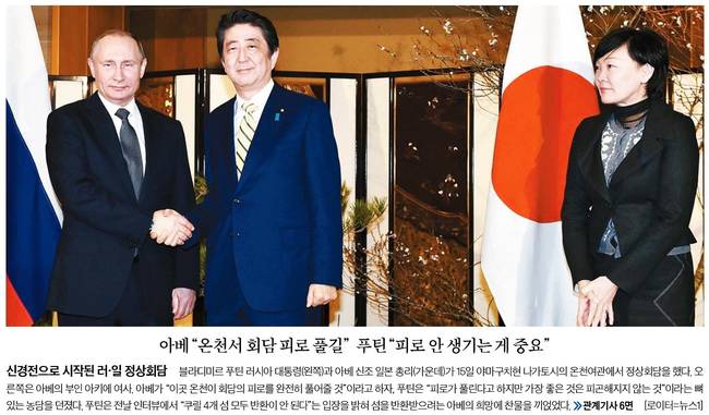 아베가 "이곳 온천이 회담의 피로를 완전히 풀어줄 것"이라고 하자, 푸틴은 "피로가 풀린다고 하지만 가장 좋은 것은 피곤해지지 않는 것"이라고 뼈 있는 농담을 던졌다. 푸틴은 전날 인터뷰에서 "쿠릴 4개 섬 모두 반환이 안 된다"는 입장을 밝혀 섬을 반환받으려는 아베의 희망에 찬물을 끼얹었다.