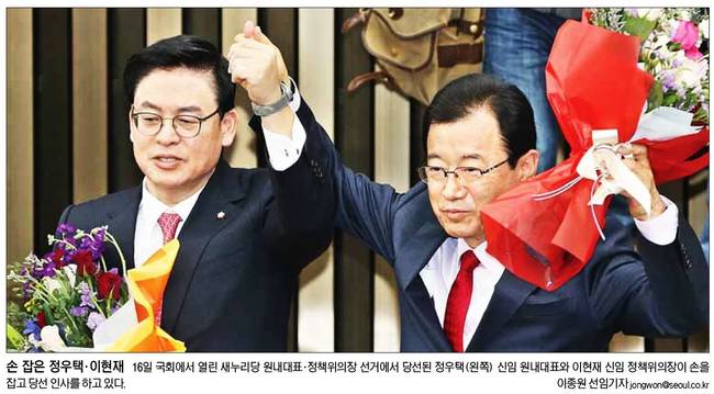 서울신문은 "새누리당 주류 친박(친박근혜)계가 16일 정우택(4선·충북 청주상당) 신임 원내대표를 탄생시키며 ‘원내’를 장악했다"며 "비주류와 당 사무처로부터 퇴진 압박을 받아 온 주류 지도부는 정 원내대표의 당선을 기다렸다는 듯 이날 총사퇴했다"고 했다.