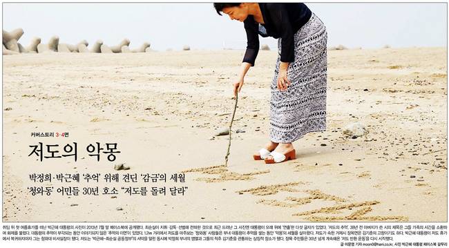 한겨레는 박 대통령이 취임 뒤 첫 여름휴가를 보낸 저도에서 찍은 사진을 올렸다. 한겨레는 "저도는 ‘박근혜-최순실 공동정부’의 서막을 알린 동시에 박정희 부녀의 명멸과 그들의 척추 김기춘을 관통하는 상징적 장소가 됐다. 장목 주민들은 30년 넘게 계속해온 ‘저도 반환 운동’을 다시 시작했다"고 전했다.