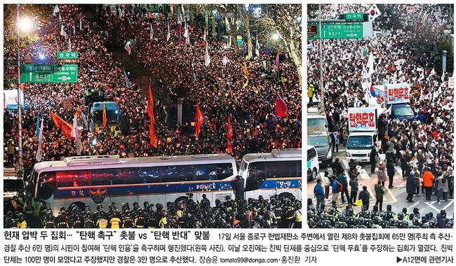 탄핵과 관련한 두 시위에 주목한 신문도 있었다. 동아일보는 17일 서울 종로구 헌법재판소 주변에서 열린 제8차 촛불집회에 65만명(주최 측 추산·경찰 추산 6만 명)의 시민이 참여해 ‘탄핵 인용’을 촉구하며 행진하는 모습과 이날 오전 친박 단체를 중심으로 ‘탄핵 무효’를 주장하는 집회가 열린 모습을 1면 사진으로 전했다. 동아일보는 “친박 단체는 100만명이 모였다고 주장했지만 경찰은 3만 명으로 추산했다”면서 “박 대통령 탄핵 심판을 앞두고 국민들이 ‘반박(반박근혜)’과 ‘친박(친박근혜)’으로 나뉘어 헌법재판소를 본격적으로 압박하기 시작했다”고 보도했다.