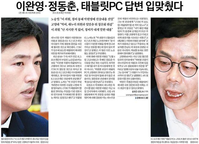 중앙일보는 K스포츠재단 관계자가 새누리당 의원과 입을 맞춰 위증할 것이라고 말한 고영태 전 더블루K 이사의 사진과 K스포츠재단 측에 태블릿PC는 JTBC가 훔친 것으로 하자며 청문회 위증을 유도했다는 의심을 받는 이완영 새누리당 의원의 모습을 1면 사진으로 전했다. 중앙일보는 “새누리당 친박 계열의 이완영 의원과 정동춘 K스포츠재단 이사장이 국회 청문회 증언을 사전에 협의한 것으로 확인됐다”며 “박영수 특별검사팀은 태블릿PC에 대한 국회 청문회 위증 의혹도 수사 대상이 될 수 있다고 밝혔다”고 보도했다.