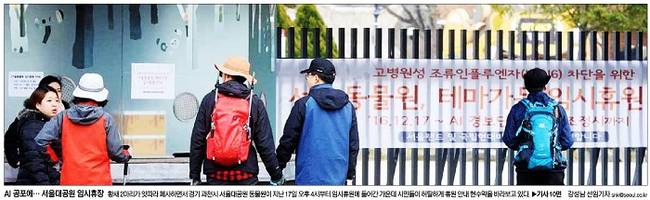 조류인플루엔자(AI) 공포가 전국을 휩쓸고 있다. 서울신문은 황새 2마리가 잇따라 폐사하면서 경기 과천시 서울대공원 동물원이 지난 17일 오후 4시부터 임시휴원에 들어간 가운데 시민들이 허탈하게 휴원 안내 현수막을 바라보고 있는 모습을 1면 사진으로 전했다. 서울신문은 “2014년 국내에 등장해 막대한 AI 감염 피해를 일으켰던 H5N8 유전자형 바이러스가 또다시 나타났다”면서 “지난달 16일 이후 한 달여 만에 닭·오리 1800만여 마리의 생명을 앗아간 H5N6에 더해 새로운 감염원이 추가된 것이다. 설상가상”이라고 보도했다.