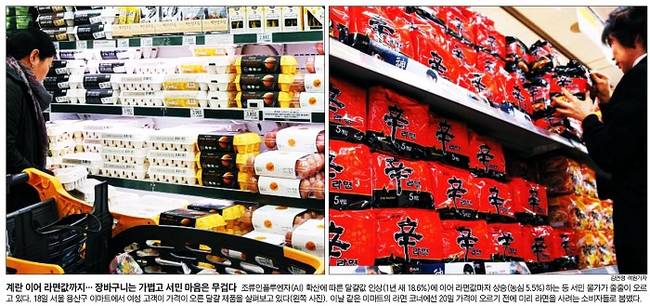 조선일보는 18일 서울 용산구 이마트에서 여성 고객이 가격이 오른 달걀 제품을 살펴보고 있는 모습을 1면 사진으로 전했다. 조선일보는 “AI 확산에 따른 달걀값 인상(1년 새 18.6%)에 이어 라면값마저 상승(농심 5.5%)하는 등 서민 물가가 줄줄이 오르고 있다”며 “이날 같은 이마트의 라면 코너에선 20일 가격이 오르기 전에 미리 라면을 사려는 소비자들로 붐볐다”고 보도했다.