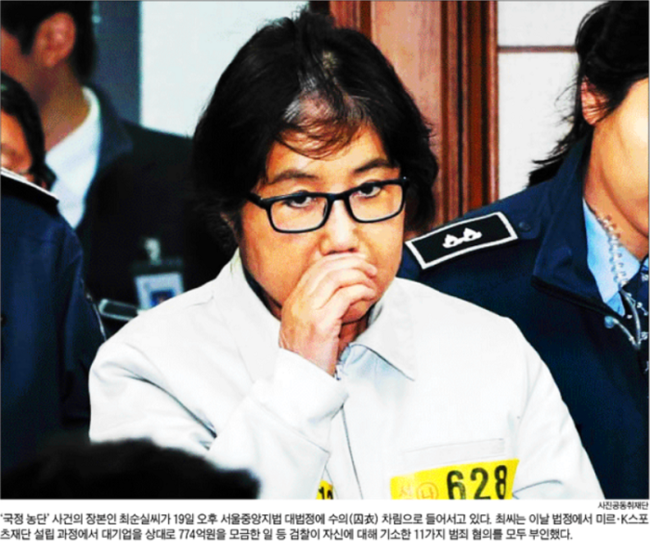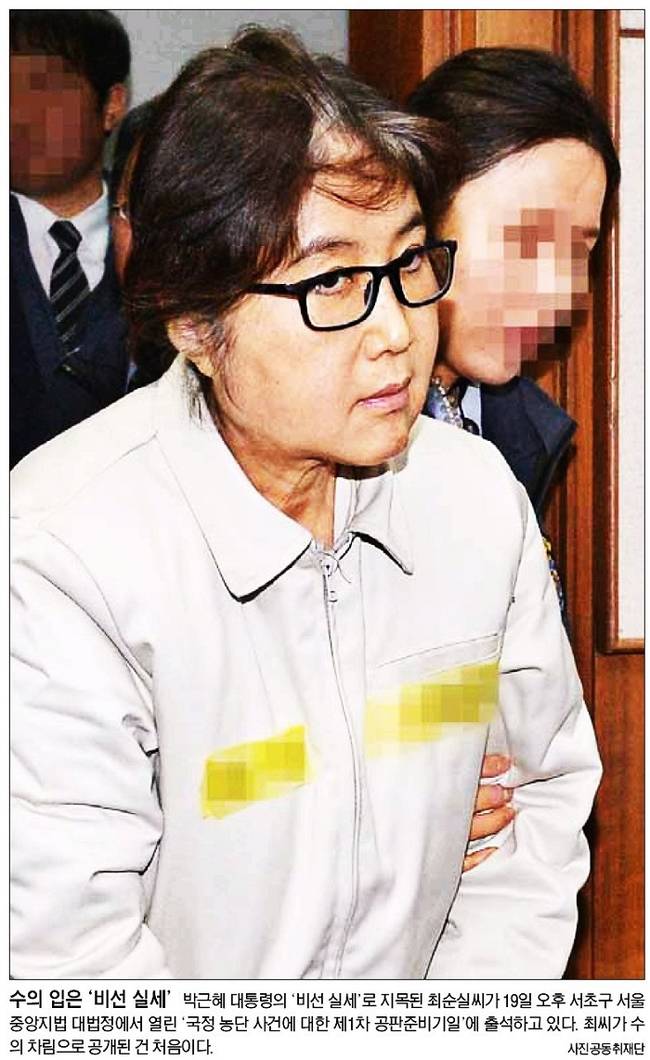 서울신문은 19일 오후 박 대통령의 ‘비선 실세’로 지목된 최씨가 서초구 서울중앙지법 대법정에서 열린 ‘국정 농단 사건에 대한 제1차 공판준비기일’에 출석하고 있는 모습을 1면 사진으로 전했다. 서울신문은 “최씨가 수의 차림으로 공개된 건 처음”이라면서 “최씨는 옷 사이로 얼굴을 파묻은 채 417호 대법정에 들어섰다. 피고인석에 앉은 뒤에도 죽 고개를 숙이고 있었다. 하지만 자신의 혐의는 강하게 부인했다”고 보도했다.