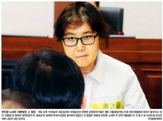 한국일보도 같은 사진을 1면에 실었다. 한국일보는 “최씨를 보기 위해 몰려든 사람들로 방청석은 가득 찼다. 2.7대 1의 경쟁률을 뚫고 방청권 추첨에 당첨된 시민 80여명은 재판이 시작되기 한 시간 전인 오후 1시부터 법원 2층 출입구 앞에 줄을 섰다”며 “취재진도 북적였다. 417호 대법정은 전두환 노태우 전 대통령의 비자금 사건 재판이 진행됐던 곳으로, 이날 이례적으로 촬영이 허용됐다”고 보도했다.