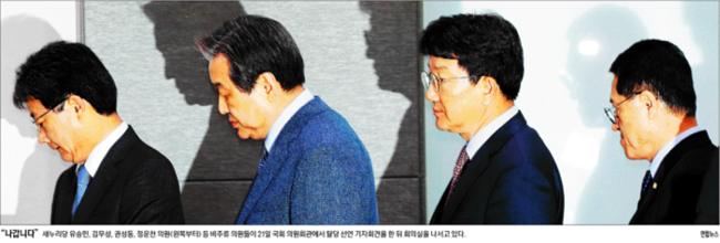 경향신문은 새누리당 유승민, 김무성, 권성동, 정운천 의원 등 비주류 의원들이 21일 국회 의원회관에서 탈당 선언 기자회견을 한 뒤 회의실을 나서고 있는 모습을 1면 사진으로 실었다. 경향신문은 “비박계가 탈당을 결행해 신당을 창당할 경우 정치권은 더불어민주당, 새누리당, 국민의당, 비박계 신당의 ‘4당 체제’로 재정립된다”며 “아울러 ‘제3지대’에서의 정계 개편과 개헌론이 급물살을 탈 가능성이 커지는 등 대선을 앞둔 정국이 크게 출렁일 것으로 예상된다”고 보도했다.
