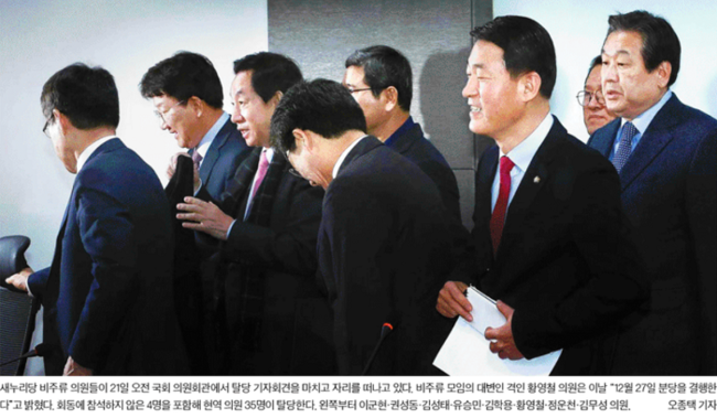 새누리당 비박계 의원 33명이 오는 27일 집단 탈당하기로 했다. 헌정사상 처음으로 보수정당의 분당이 현실화한 것이다. 이날 모든 신문들은 보수의 분열을 1면 사진으로 전했다.