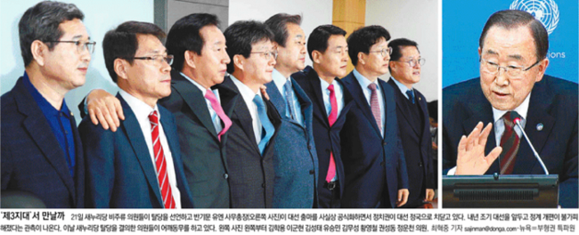 동아일보는 탈당을 선언한 비주류 의원들과 반기문 유엔 사무총장의 사진을 나란히 1면에 실었다. 동아일보는 “내년 대선의 양대 변수로 꼽힌 새누리당의 분당과 반기문 총장의 대선 출마 선언이 21일 거의 동시에 이뤄졌다”며 “반 총장은 20일(현지시간) 미국 뉴욕 유엔본부에서 한국 특파원들을 만나 ‘대한민국 발전에 도움이 된다면 제 한 몸 불살라서라도 노력할 용의가 있다. 국민 복리와 민생 증진을 위해 몸을 사리지 않겠다’고 강조했다”고 보도했다.