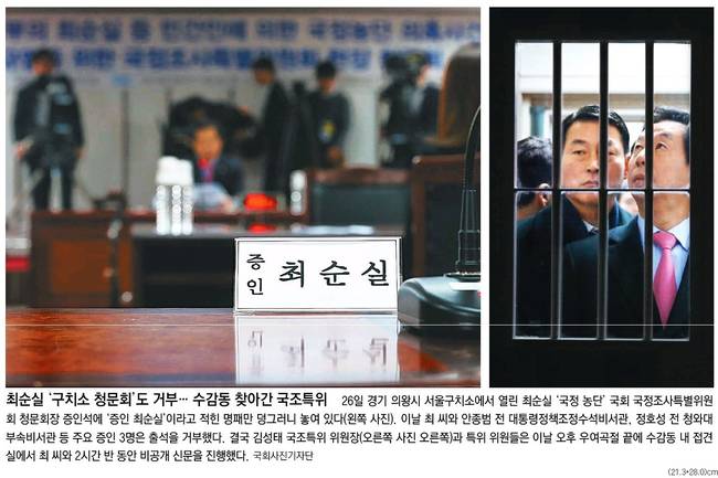 박근혜 대통령 탄핵 사태를 부른 최순실씨가 26일 서울구치소에서 열린 국회 국정조사특위 비공개 청문회에 출석했다. 최씨는 “종신형을 받을 각오가 돼 있다”면서도 미르·K스포츠재단 설립 등 각종 범죄혐의에 대해선 부인했다. 이날 안종범 전 청와대 정책조정수석, 정호성 전 청와대 부속비서관에 대한 비공개 청문회도 서울 남부구치소에서 열렸다. 27일 거의 모든 주요 일간지들은 구치소에서 열린 청문회와 관련 소식을 신문 전면에서 다뤘다.