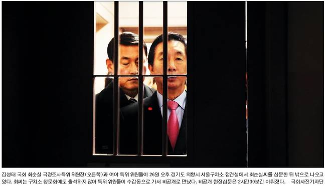 한겨레신문도 같은 사진을 1면에 걸었다. 한겨레는 관련기사에서 “김기춘 전 대통령 비서실장이 재임 중 김진태 당시 검찰총장에게 수시로 전화를 걸어 통화한 것으로 확인됐다”며 “또 2014년 말 이른바 ‘정윤회 문건 유출 사건’ 당시 정씨 집에 대한 압수수색이 이뤄지지 않은 것은 서울중앙지검의 자체판단이 아니라 김 총장의 지시에 따라 이뤄진 일로 밝혀졌다”고 게재했다.