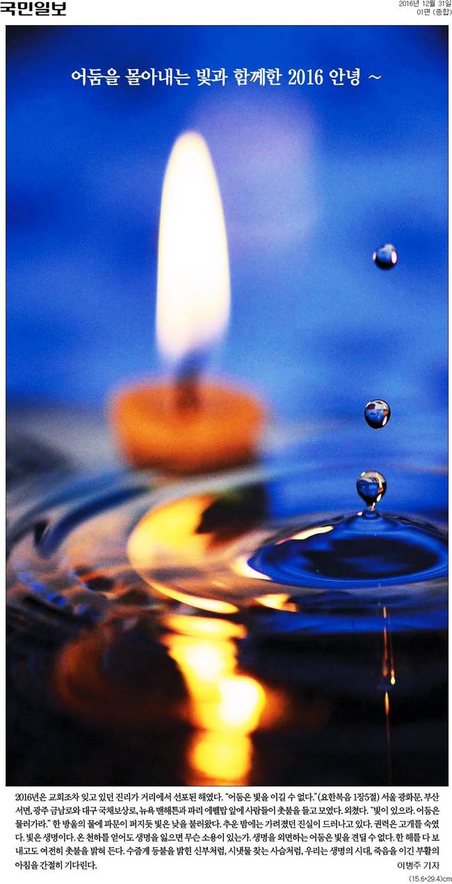 세계일보는 "어울리지 않게 깊은 생각에 잠겨 있는 어린 얼굴을 촛불이 환하게 비춘다. 자사 사진기자들이 토요일마다 취재한 '탄핵' '퇴진' '구속' 이미지들로 모자이크한 것"이라며 "자정이 넘으면 저 아이의 눈빛도 사랑으로 빛날 수 있을까. 바람 불어도 꺼지지 않을 가슴속 촛불로. 액일랑 여기 두고 잘가라. 병신년"이라고 했다.