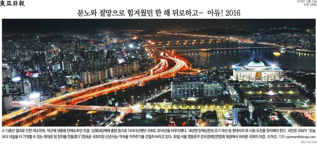 동아일보는 "4.13 총선 결과로 인한 여소야대, 박근헤 대통령 탄핵소추안 의결, 신 4당체제 출범 등으로 다사다난했던 국회도 2016년을 마무리했다"며 "내년엔 탄핵심판과 조기 대선 등 현대사의 또다른 도전을 맞이해야 한다"고 했다.