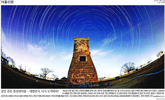 서울신문은 "경북 경주 첨성대는 1978년 지진 관측 이후 가장 강력했던 9.12 경주지진에 크게 흔들렸지만 결코 무너지진 않았다"며 "굳건하게 시련을 이겨내고 밝은 새벽을 부르는 정유년에 새로운 도약과 변화를 꿈꿀 것"이라고 했다.