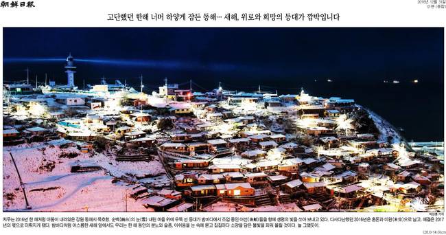 조선일보는 "저무는 2016년 한 해처럼 어둠이 내려앉은 강원 동해시 묵호항"이라며 "밤바다처럼 새해 앞에서도 우리는 한 해 동안 분노와 슬픔, 아쉬움을 눈 속에 묻고 집집마다 소망을 담은 불빛을 피워 올릴 것"이라고 했다.
