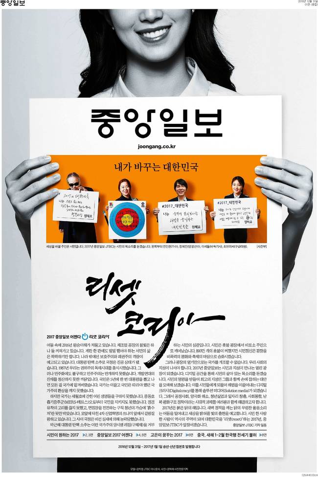 중앙일보는 2017년 어젠다로 정한 '리셋 코리아'를 1면에서 소개했다. 중앙일보는 "시민정신은 광장을 비폭력의 평화와 축제의 마당으로 승화시켰다"며 "그러나 광장의 열기만으로 국가를 개조할 수 없다. 우리 사회의 지성이 나서야 한다. 2017년 중앙일보는 시민과 지성이 만나는 열린 광장이 될 것이다. 시민의 명령의 받들어 최고의 지성인 그룹과 함께 손에 잡히는 대안을 모색할 것"이라고 밝혔다.