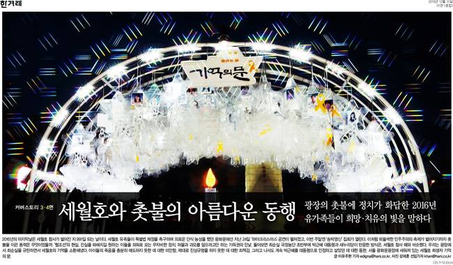 한겨레는 "헬조선의 현실, 진실을 파헤치길 원하는 이들을 좌파로 모는 무자비한 정치, 허물과 과오를 덮으려고만 하는 기득권의 민낯. 돌아보면 최순실 국정농단 초반부터 박근혜 대통령과 새누리당이 반응한 방식은 세월초 참사 때와 비슷했다"며 "우리는 광장에서 최순실을 규탄하면서 세월호 기억을 소환해냈다"고 했다.