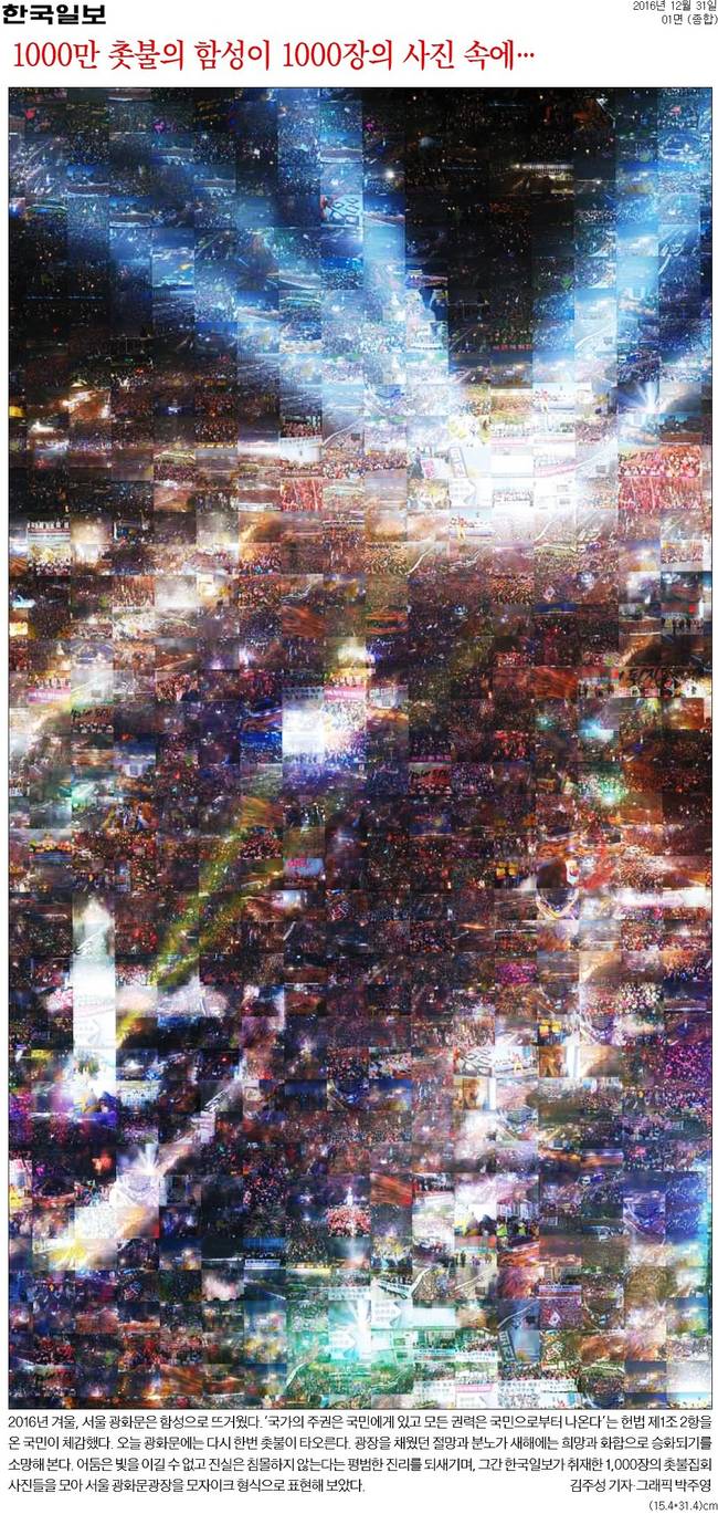 한국일보는 "2016년 겨울, 국가의 주권은 국민에게 있고 모든 권력은 국민으로부터 나온다는 헌법 제1조 2항을 온 국민이 체감했다"며 "어둠은 빛을 이길 수 없고 침몰하지 않는다는 평범한 진리를 되새기며 자사가 취재한 1000장의 촛불집회 사진들을 모아 서울 광화문 광장을 모자이크 형식으로 표현했다"고 설명했다.