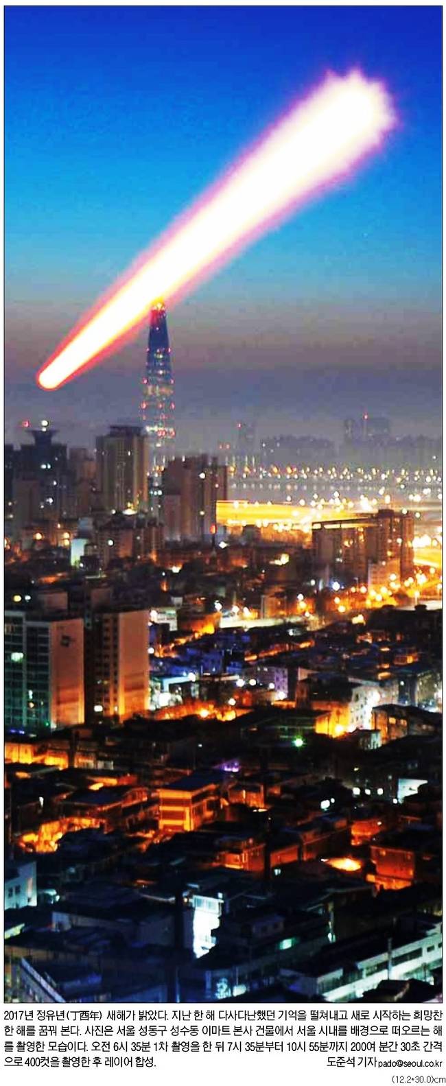 세계일보는 롯데월드타워에서 바라본 정유년 첫날 서광의 모습을 1면에 담았다. 세계는 관련기사에서 “더불어민주당 문재인 전 대표와 반기문 전 유엔 사무총장이 대선주자 지지도에서 양강 체제를 구축하고, 이재명 성남시장이 그 뒤를 추격하고 있는 것으로 나타났다”면서 “올해 대통령 선거의 이슈로는 공정사회가 가장 중요하다는 의견이 많았다”고 보도했다. 세계에 따르면 이들의 지지도는 각각 문 전 대표 25.1%, 반 전 총장 21.3%, 이 시장 16.3%였다